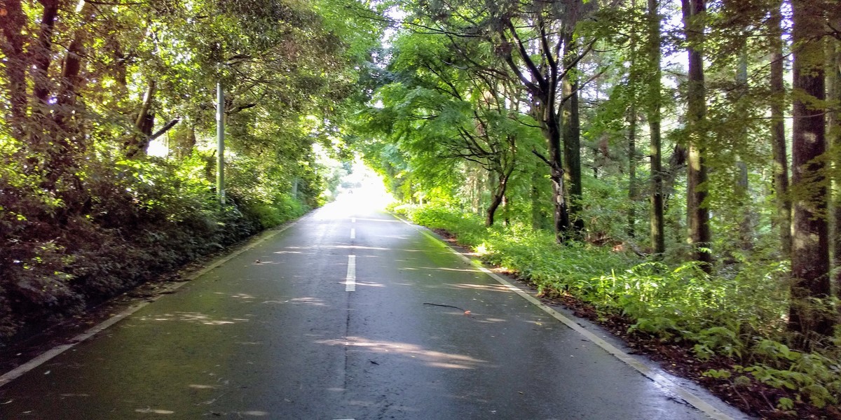 雨上がり、陽が差し込んできた森の道。思わず止まって写真を撮った。夏の気配を濃厚に感じた♬