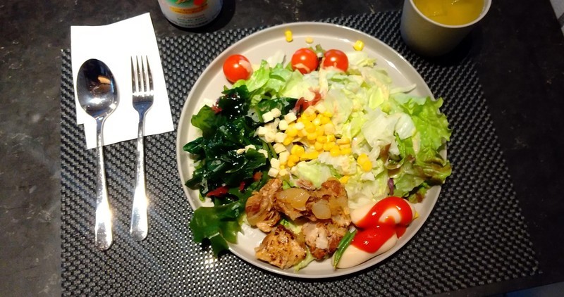 シャワー浴びて朝ごはん。1日で一番楽しみな時間です。ノンアル梅酒ソーダ持ち込み、てんこ盛りサラダ、角煮、ソーセージ少し、わかめが厚めでシャキシャキ歯ごたえで美味しい〜。このあとナスを茹でたのと角煮を加えた沖縄そば(小)で完結。