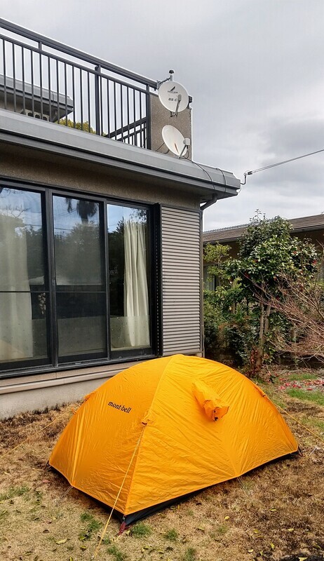 テントがまだ使えるか降雨テスト。ちょうど今晩、前線通過で雨模様。北アルプスにはテント持参しなくて山小屋泊予定なんですが、練習で行く登山(久住・宝満山)で宿泊予定なので。見た目はカビもなくOKです。
