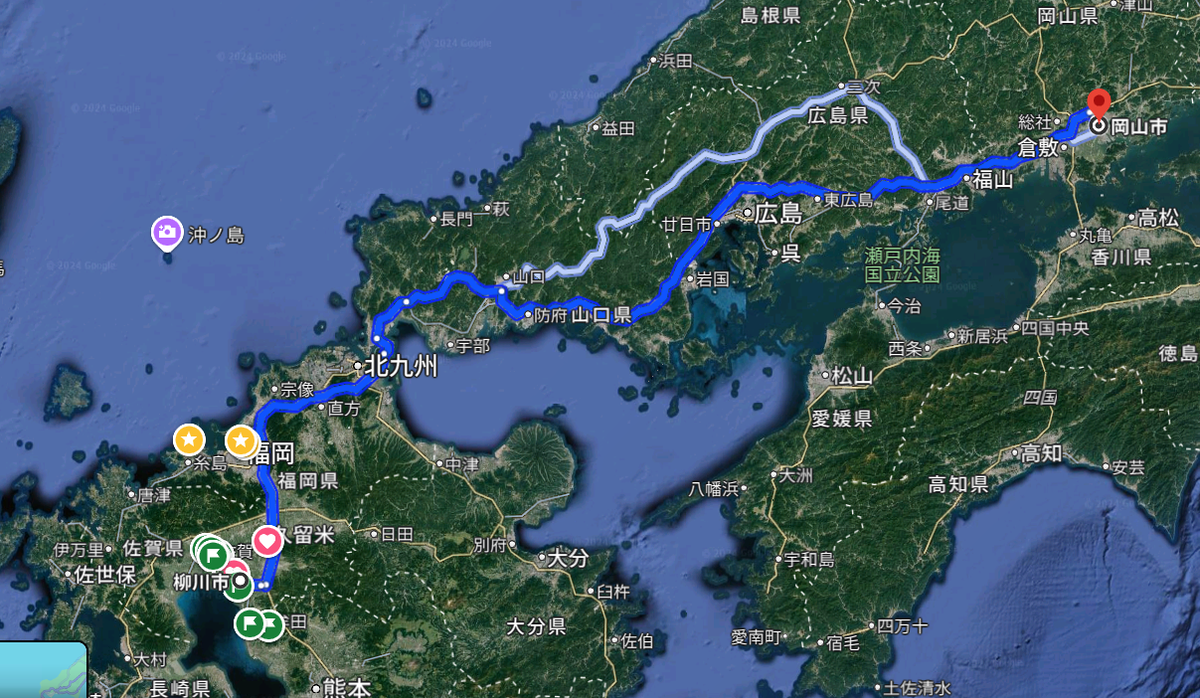 今日は岡山までの500㎞走行です。北アルプスへはいつも阪九フェリーで小倉から神戸まで移動するのですが、今回は初めて高速を運転して石川まで行ってみようと思います。一気に1000kmを運転して移動するのは危険なので、のんびり石川まで1泊2日です。