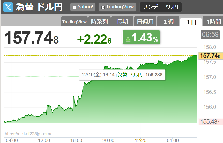 市場では、今回の利上げが「円安を止めるためのもの」という期待もありましたが、結果として「日銀は急いで利上げを続けない」という確信を投資家に与えてしまったことが、円安急進(一時1ドル=157円台)の引き金となりました。